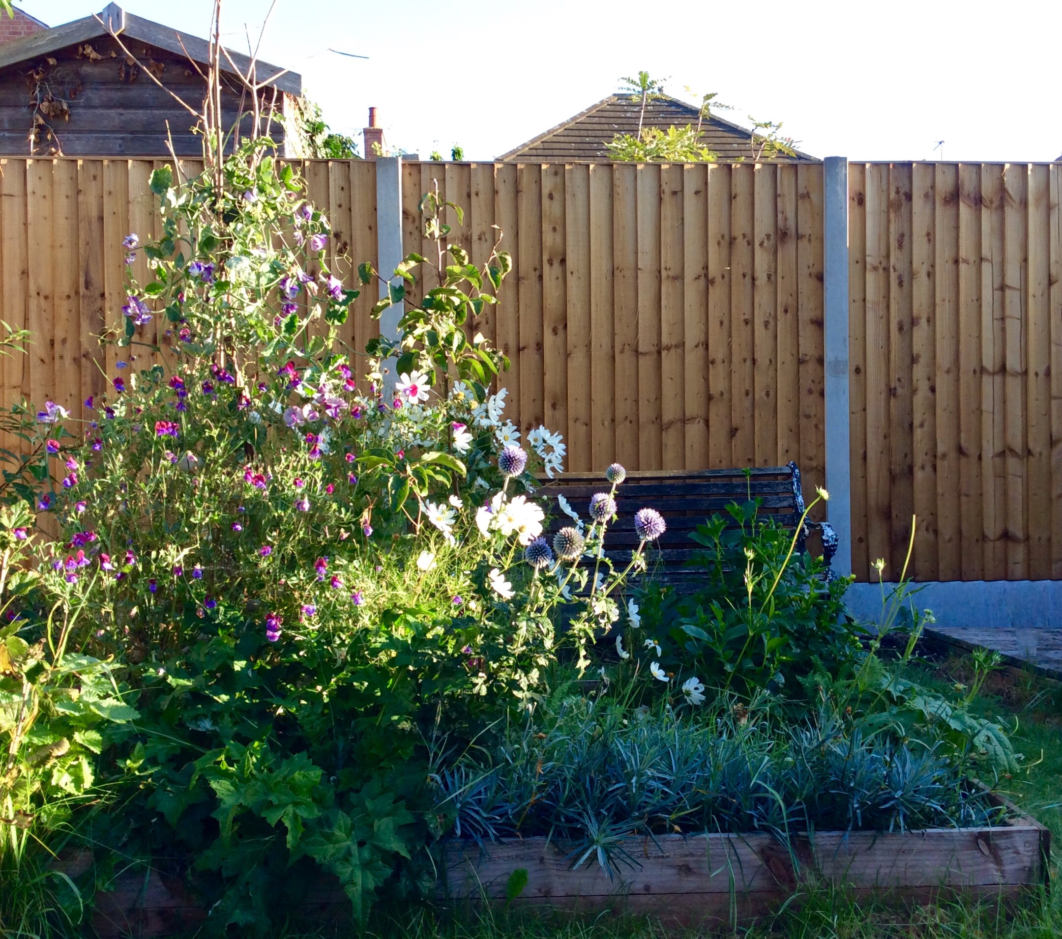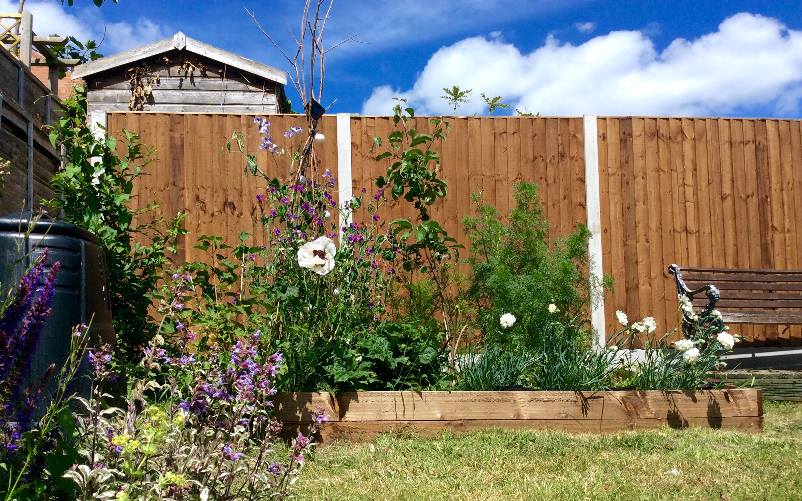 Early July – sweet peas, poppies and pinks in bloom (and a new fence that needs a bit of sun bleaching)