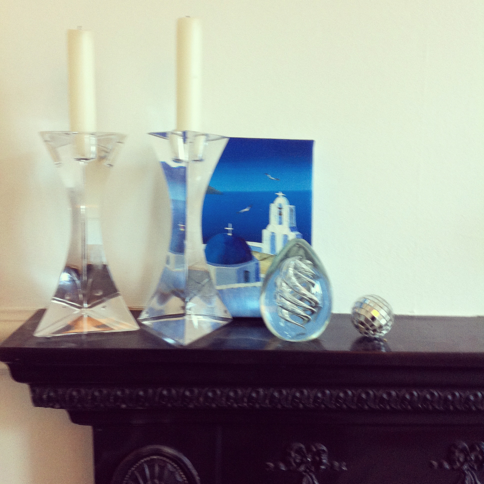Print tray from Mum, tat from my travels. Lamp base Habitat Spindle, shade John Lewis (thanks Mum). Wall lights IKEA separate bases and shades. Origami pendant my £6 sale find at Next Home. Steel candelabra old Habitat, glass candlesticks wedding prezzie from the girls. Bowl (on table) wedding present from Tom from Morocco (note the excellent taste of mes amis). Cushions: pink quilted an old Muji buy, blue striped IKEA outdoor cushion, floral TKMaxx. Pictures: Danish chairs an Ebay find in IKEA frame, mini canvas a tenner from a tourist tat shop on Mykonos. Paperweight TKMaxx, mirrorball from the Christmas tree, beads (on light) from Topshop years ago, blanket from Tweedmill (thanks to sister in law).