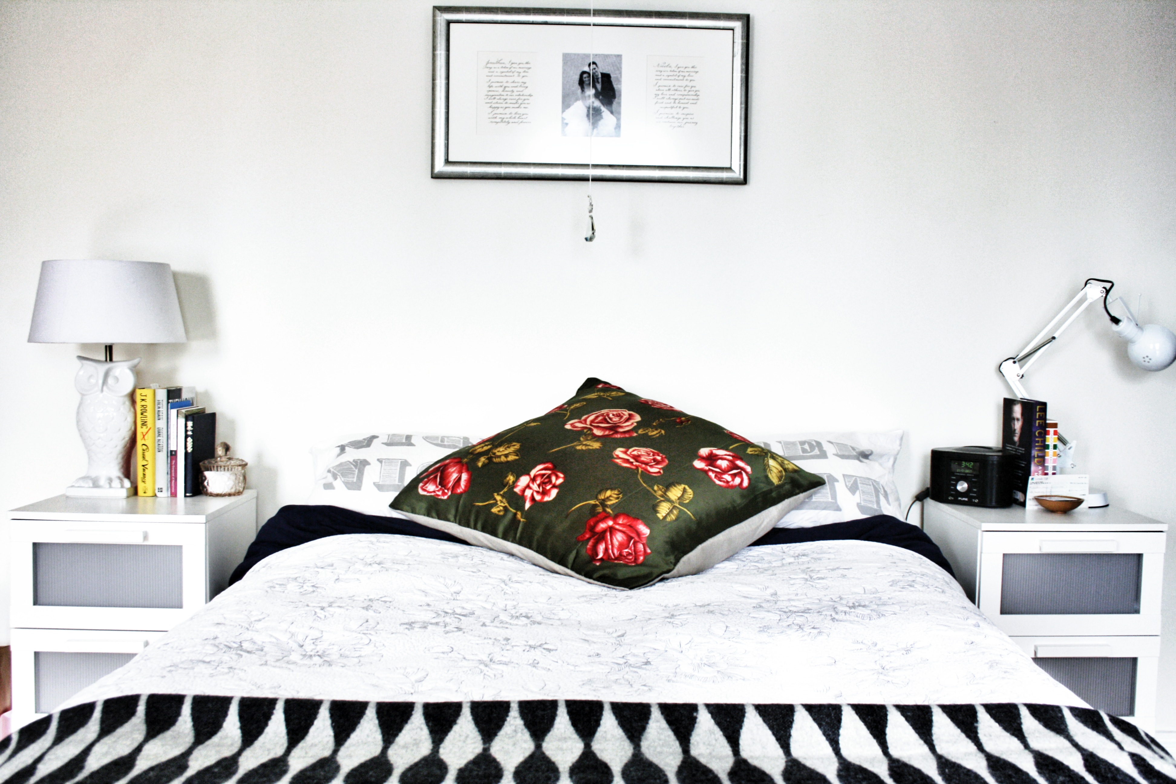 Recently I finally got round to it and I think the one I’ve finished makes the perfect accessory in our newly finished bedroom. I’ve used a 60cm x 60cm cushion from Dunelm but to be honest it isn’t really big enough so I’m intending to order some even bigger ones from a store on eBay soon. I am not an experienced seamstress, in fact I’d go so far as to say I’m not even very competent so that’s possibly why I put it off for so long. I’ve gone for a grey linen type backing and I’ve opted for a pillow case opening at the back rather than a zip (it seemed easier!).