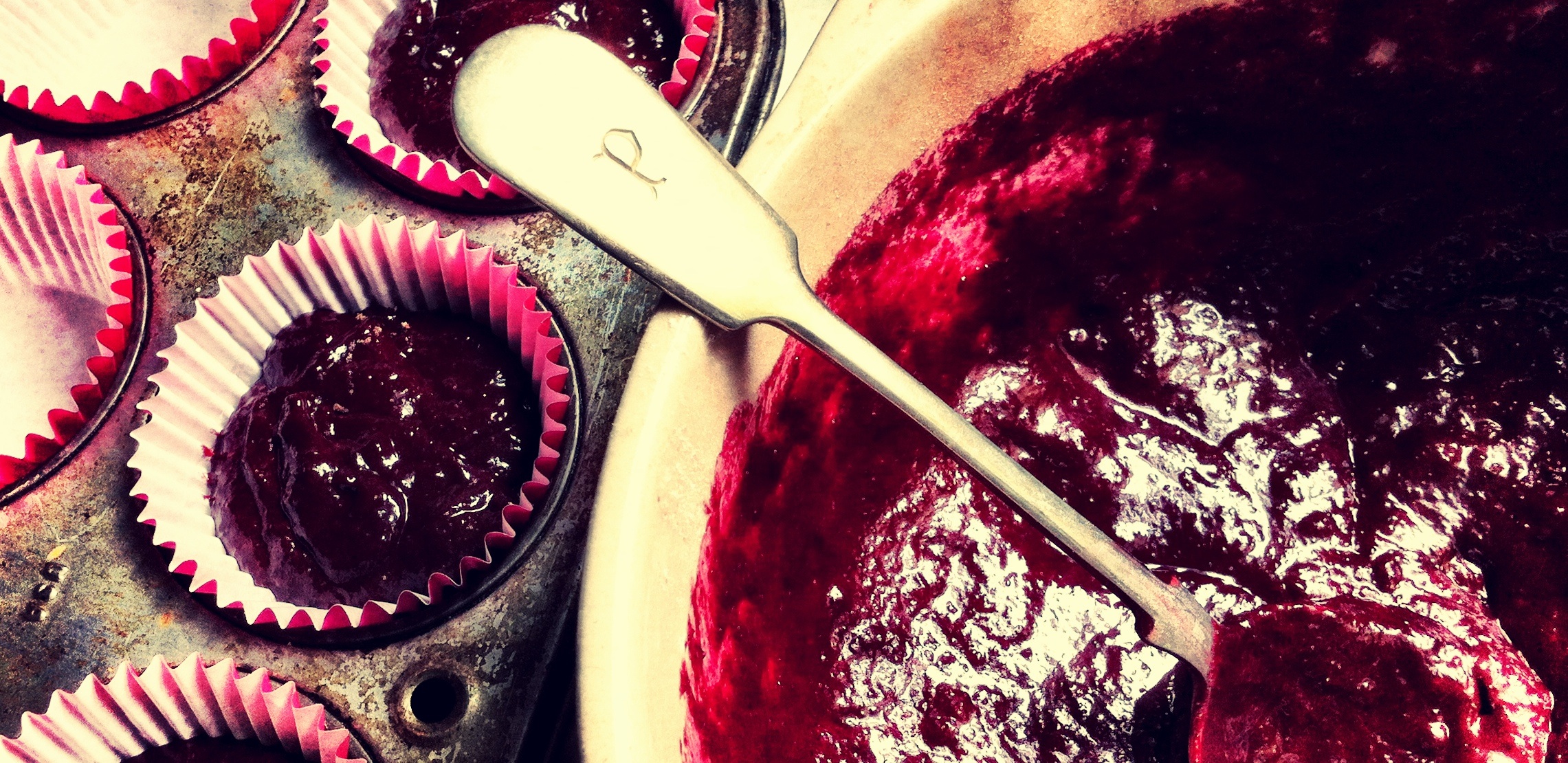 Beetroot and chocolate muffins, great grandma’s monogrammed spoon. We haven’t quite been up to eating the volume of beetroot that’s arrived in our veg box ‘au naturel’.