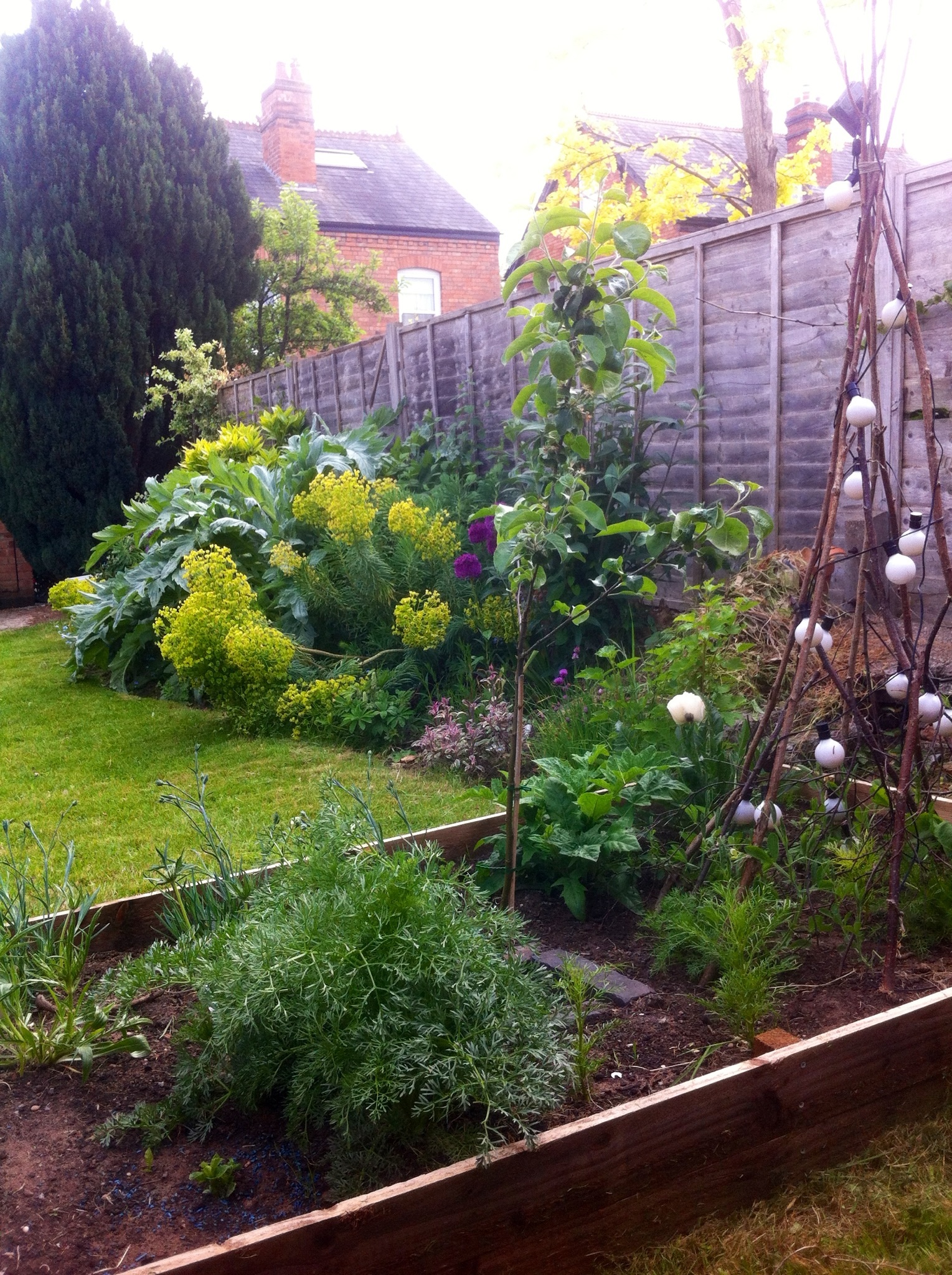 Tulips have given way to more autumn-planted Wilkos bulbs: this time allium purple sensation. I am rather enjoying the emerging structure, and spotting and noting the gaps to be filled with more bulbs and divided perennials in the months and years to come. In the end I set up my raised bed cut flower patch in the back garden. The Sarah Raven seedlings and a few home-sown sweet peas are growing fast, and I’m glad I chose mostly perennials as they should turn out to be a lasting investment for the house as well as the garden. We have enjoyed our first home-grown rhubarb crumble his week too. Apples will have to wait as I’ve pinched off most of the fruitlets from our Stoke Edith Pippin (a local Apple, grafted by a friend last year), to get some good growth on this season. We’re having a new rear fence built in a week or so too, which will make a huge impact on privacy and tidiness at the sunny end of the garden. The only bad news is that our neighbour has vigorously pruned her grape vine so the sneaky branch we trained along our fence has bitten the dust, so no grapes from the garden this year. They were so good we might have to invest in our own vine.