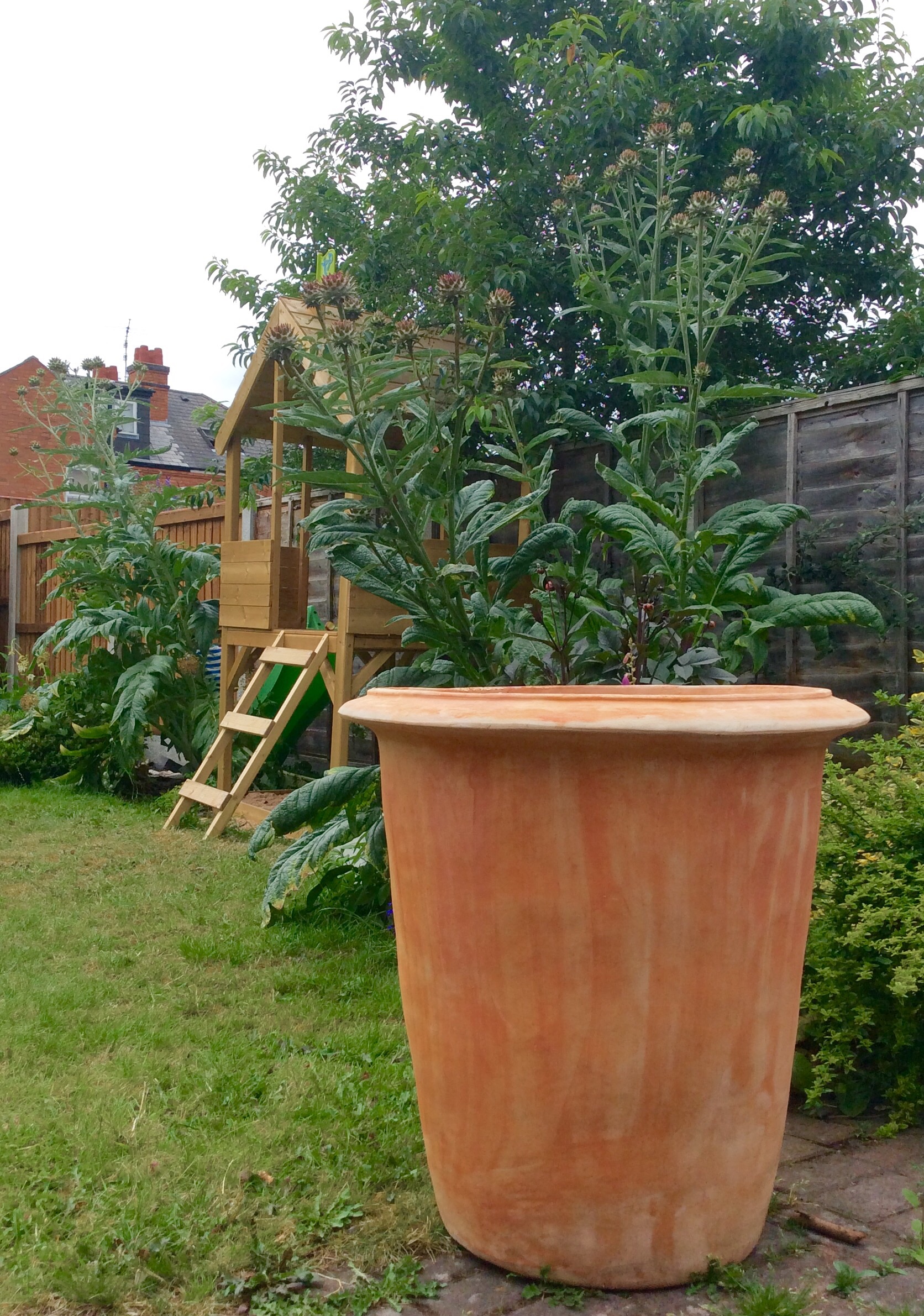 As you can see we’ve also moved the play house/sand pit to one of the shadier borders, and the slide now takes a route behind the cardoons, making it a bit junglesque for the small people (can you spot the two year old in the undergrowth?). Not very classy, but at £200 from Argos, and a huge hit with the kids, it’s a goodun (and arguably offers some structure/height to the garden, drawing the eye away from neighbours’ houses). Unfortunately, apart from my raised bed cutting patch it’s mostly tiny perennials,bare earth, dandelions and bindweed this July, but I have high hopes for next year…